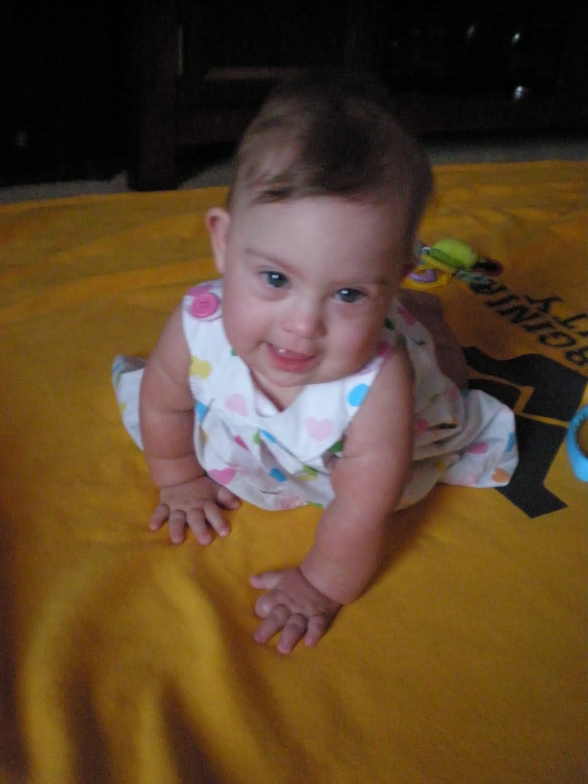 She also got some pants from her PT to help her keep her legs together and hips secure. When Rachel brings her knees under her to get into her hands and knees position, these pants will work the muscles on the inside of the legs which will help her with crawling. I put them on her today for about 20 minutes and when she did get into her hands and knees position, she was able to stay there for a good 30 seconds and rock back and forth. The pants kept her legs from "frogging" out. Seeing her being able to hold that position for so long makes me excited and I know for sure she will be wearing them more often now. I can't wait until she can crawl! She is so much fun now I can't even imagine what she will be like when she is mobile.